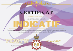 Du 15 mai au 14 juillet 2022, l'indicatif d'appel d'événement spécial VX3OTW sera utilisé périodiquement pour célébrer le jubilé de platine de Sa Majesté la reine Elizabeth II, marquant son 70e anniversaire sur le trône. Un certificat de reconnaissance sera mis à disposition ci-dessous pour ceux qui prendront contact avec VX3OTW pour commémorer cet événement canadien.